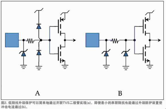 在任何情況下,IC供應商在產品里設計的保護裝置總是有限的。在設計良好、使用正常的情況下,它們作為次要的防護裝置效果十分顯著;但是,當它們作為瞬態電壓事件的主要防護裝置時,由于離瞬態切入點距離遠、并且規模有限,它們的防護效果就十分不理想。尤其對于在使用時難以控制的便攜設備來說,情況更是如此。