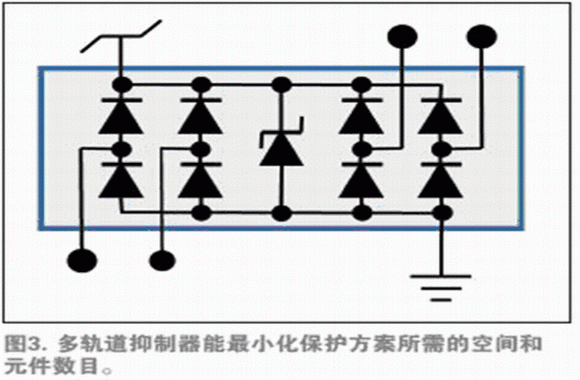 如果產品要在輸入/輸出線中承受某些額外阻抗(如在單端邏輯輸入時經常出現的情況),可以通過在外部夾鉗和IC引腳之間增加一個電阻器,使外部和芯片上二極管之間的電流有助于外部防護(圖2b)。一些TVS二極管供應商在單一小型組件包里提供兩個結型二極管和一個TVS夾鉗,進一步減少組件數目、降低裝配成本,避免互連偏離。這些組件包同樣適用于多軌道情況——單一的組件包為幾條普通供電軌提供保護(圖3)。