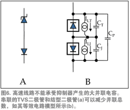 ,其中,CJ是結型二極管的斷開狀態電容(圖6b)。如果發生瞬態時復合設備正在運行,結型二極管正向偏置。特定峰值電流的耗損比TVS二極管在雪崩模式下運行的耗損要少得多。結型二極管的結點區及其電容也更小。因此,結型二極管的電容可支配兩個二極管的寄生串聯,并且減少了復合設備的總體斷路電容。