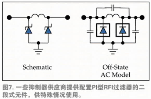類似圖1b中的片上二段夾鉗結構也應用于外部夾鉗,在相同設備中同時實現瞬態超電壓防護和電磁干擾(EMI)過濾。這種布局是基本的π形網絡,同時,TVS二極管的寄生電容有利于完成EMI過濾。電阻和感應網絡均可直接利用,滿足各種實體電路層對于信令的具體要求(圖7)。抑制器供應商通常按照通信標準在選擇器向導中對元件加以區分,確保適當的帶寬和某些特性阻抗的應用。