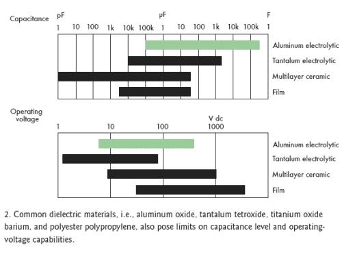 [page]標準電容的結構是在兩個附屬于金屬板上的電極之間夾一層電介質層(圖1)。根據電容類型不同,電介質可以是氧化鋁、四氧化鉭、氧化鈦鋇或聚丙烯聚酯,不同的材料決定了不同的容量和電壓特性(圖2)。電介質的多少和極板間的距離也會影響電容量。然而,極板間最大允許距離限制了電介質的數量。