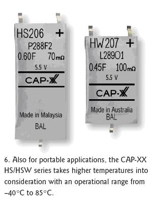 CAP-XX公司專門針對便攜式市場推出了GS/GW系列單節和雙節超級電容器(圖5)。這些電容提供了電能有限的電池的替代品,壽命非常長,單節配置電壓為2.3V,串聯連接的雙節電容器電壓可達4.5V。