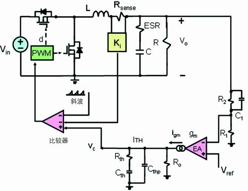 電流取樣電阻在輸入端的降壓轉(zhuǎn)換器如圖1所示。在電流模式的降壓轉(zhuǎn)換器拓樸結(jié)構(gòu)中,反饋有兩個(gè)環(huán)路:一個(gè)電壓外環(huán),另一個(gè)是電流內(nèi)環(huán)。電壓外環(huán)包括電壓誤差放大器、反饋電阻分壓器和反饋補(bǔ)償環(huán)節(jié)。電壓誤差放大器的同相端接一個(gè)參考電壓Vref,反饋電阻分壓器連接到電壓誤差放大器反相端VFB,反饋環(huán)節(jié)連接到VFB和電壓誤差放大器的輸出端VC。若電壓型放大器是跨導(dǎo)型放大器,則反饋環(huán)節(jié)連接到電壓誤差放大器的輸出端VITH和地。目前,在高頻DC/DC的應(yīng)用中,跨導(dǎo)型放大器應(yīng)用更多。本文就以跨導(dǎo)型放大器進(jìn)行討論。輸出電壓微小的變化反映到VFB引腳,VFB引腳電壓與參考電壓的差值被跨導(dǎo)型放大器放大,然后輸出,輸出值為VITH。跨導(dǎo)型放大器輸出連接到電流比較器的同相端,電流比較器的反相端輸入信號(hào)為電流檢測(cè)電阻的電壓信號(hào)VSENSE。由此可見,對(duì)于電流比較器,電壓外環(huán)的輸出信號(hào)作為電流內(nèi)環(huán)的給定信號(hào)。對(duì)于峰值電流模式,工作原理如下:在時(shí)鐘同步信號(hào)到來時(shí),高端的主開關(guān)管開通,電感激磁,電流線性上升,電流檢測(cè)電阻的電壓信號(hào)也線性上升。由于此時(shí)電壓外環(huán)的輸出電壓信號(hào)高于電流檢測(cè)電阻的電壓,電流比較器輸出為高電壓;當(dāng)電流檢測(cè)電阻的電壓信號(hào)繼續(xù)上升,直到等于電壓外環(huán)的輸出電壓信號(hào)時(shí),電流比較器輸出翻轉(zhuǎn),從高電平翻轉(zhuǎn)為低電平,邏輯控制電路工作,關(guān)斷高端主開關(guān)管的驅(qū)動(dòng)信號(hào),高端的主開關(guān)管關(guān)斷,此時(shí)電感開始去磁,電流線性下降,到下一個(gè)開關(guān)周期開始的時(shí)鐘同步信號(hào)到來,如此反復(fù)。