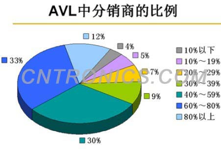 在合格供應商清單(AVL,Approved Vendor List)中,有超過1/3的電子整機廠商的AVL中分銷商比例超過六成,1/3的整機廠商的AVL中分銷商占據半壁江山。總體有超過2/3的整機廠商中有一半的產品供應來自分銷商。可見分銷商在電子元器件供應鏈中扮演重要角色。