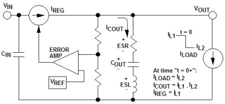 穩壓器的電流源(IREG)不能立即發生變化,因此在“t = 0+”時刻(也就是負載電流增加到IL2的瞬間),IREG = IL1。通過簡單節點分析得出,此時電流源需要輸出電容: