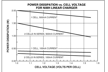 圖5. 采用5.0V電壓的USB端口對NiMH電池充電時,線性調(diào)整器件的功耗[page]