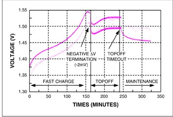 通常采用恒流源對NiMH電池充電。當(dāng)達(dá)到充滿狀態(tài)時,會發(fā)生放熱化學(xué)反應(yīng),并導(dǎo)致電池溫度上升,電池端電壓降低??蓹z測電池溫度上升速率或者負(fù)向電壓變化率,并用來終止充電。這些充電終止方法分別稱為dT/dt和-ΔV。充電速率非常低時,dT/dt和-ΔV不太明顯,很難精確檢測到。電池開始進(jìn)入過充狀態(tài)時,dT/dt和-ΔV響應(yīng)開始顯現(xiàn)。此時如果繼續(xù)充電,將損壞電池。