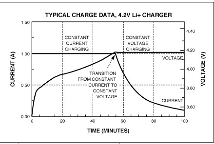圖2. 使用CCCV充電器對Li+電池充電時的典型曲線