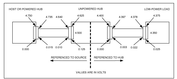 當(dāng)USB端口帶有一個總線供電的USB集線器,集線器上接了低功耗設(shè)備時,USB口上允許的直流電壓跌落如圖1所示。大功率負(fù)載與總線供電的集線器連接時,電壓跌落將超過圖1給出的指標(biāo),并會引起總線過載。