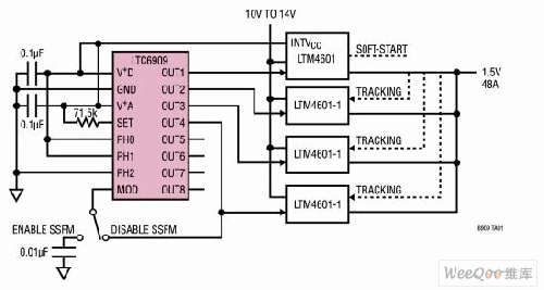 硅振蕩器為多相、擴(kuò)頻開(kāi)關(guān)穩(wěn)壓器時(shí)鐘提供了一個(gè)理想的平臺(tái)。除了具有一個(gè)板上時(shí)鐘發(fā)生器之外,這些固態(tài)器件還能將擴(kuò)頻調(diào)制與多相輸出組合起來(lái)。考慮到這一點(diǎn),凌力爾特公司開(kāi)發(fā)出了LTC6909(圖1),這是一款具有8個(gè)單獨(dú)多相輸出的精準(zhǔn)擴(kuò)頻硅振蕩器。單個(gè)電阻器負(fù)責(zé)在12.5kHz至 6.67MHz的范圍內(nèi)選擇輸出頻率。三個(gè)邏輯輸入用于設(shè)定輸出相位關(guān)系(范圍從45°至120°),從而允許LTC6909為多達(dá)8個(gè)相位提供同步。可以啟用一種偽隨機(jī)擴(kuò)頻調(diào)頻,頻率擴(kuò)展量在中心頻率的±10%。用戶可選擇3種調(diào)制速率之一,以確保調(diào)制速率不超過(guò)穩(wěn)壓器的帶寬。此外,LTC6909還具有一個(gè)創(chuàng)新的濾波器,該濾波器負(fù)責(zé)跟蹤SSFM調(diào)制速率并在頻率轉(zhuǎn)換之間提供平滑處理。
