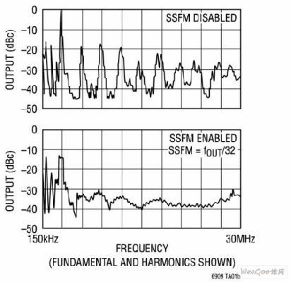 除了多相同步之外,還可以通過(guò)連續(xù)改變開(kāi)關(guān)穩(wěn)壓器時(shí)鐘的頻率來(lái)改善EMI。這種被稱為SSFM的技術(shù)不允許發(fā)射能量在任何接收器的頻段中停留過(guò)長(zhǎng)的時(shí)間,從而改善了EMI。為了最大限度地發(fā)揮SSFM的效用,主要有4個(gè)必需考慮的因素:受影響接收器的帶寬、頻率調(diào)制的方法、頻率擴(kuò)展量和調(diào)制速率。