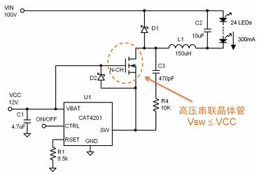 CAT4201可采用最高36 V的電源電壓供電,并兼容于12 V和24 V標準照明系統。圖4顯示的是CAT4201的高壓LED驅動器配置,外圍的N溝道MOSFET支持高壓輸入:100 V輸入電壓時LED功率達30 W;50 V輸入時LED功率達13 W。
