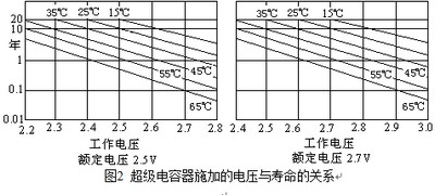 與鋁電解電容器不同,超級電容器施加電壓的壽命要比不施加電壓的壽命短。在額定電壓以下,超級電容器施加的電壓與超級電容器壽命的關系如圖2。