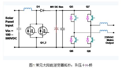 升壓+H-橋拓?fù)涫翘柲苣孀兤鳂O為常用的拓?fù)渲唬且环N兩級非隔離拓?fù)洹F涞谝患壥巧龎杭墸糜诎涯K的可變輸出電壓(例如100V – 500V)升高到更大的中間電壓,后者必須大于實(shí)際峰值主線電壓(如230V x sqrt(2),或>325V)。該升壓級還有一個重要作用,就是為了實(shí)現(xiàn)效率最大化,太陽能模塊必須運(yùn)作產(chǎn)生盡可能大的功率,而太陽能模塊的功率 曲線可通過輸出電流乘以輸出電壓數(shù)值獲得。功率特性中有一個最大點(diǎn),被稱為“最大功率點(diǎn)”或MPP,而這精確位置會隨著模塊的類型、溫度和日照陰影等因素而變化。