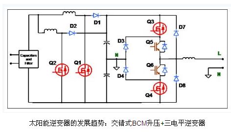 有很多方法能夠提高升壓逆變器的效率。由于升壓逆變器可在連續(xù)傳導(dǎo)模式或邊界傳導(dǎo)模式(CCM 或 BCM)下工作,這就衍生出不同的優(yōu)化方案。在CCM模式中,損耗的一大主因是升壓二極管的反向恢復(fù)電流;在這種情況下,一般使用碳化硅二極管或飛兆半導(dǎo)體的Stealth 二極管來解決。太陽能逆變器更常采用的是BCM模式,而盡管對這類功率級通常建議選擇CCM模式,但采用BCM模式的原因在于BCM模式中二極管的正向電 壓要低得多。而且,BCM模式也具有高得多的EMI濾波器和升壓電感紋波電流。這時,良好的高頻電感設(shè)計(jì)是一解決方案。