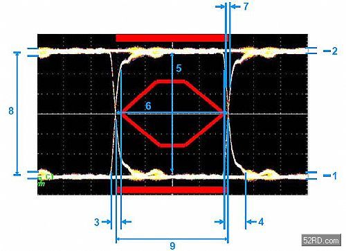 通過在示波器的垂直軸對數(shù)字信號進(jìn)行反復(fù)采樣、同時采用相應(yīng)數(shù)據(jù)率對水平時間掃描進(jìn)行觸發(fā)來生成眼圖。所獲得的圖形看上去象眼睛,如圖1所示。“眼睛”越大,數(shù)據(jù)完整性越高。通常采用模板(mask)來對可接受的信號質(zhì)量進(jìn)行定義。這模板由“眼睛”中間的六角形和“眼睛”上、下的矩陣組成。如果測得的信號跡線穿越模板的邊線,那么信號質(zhì)量就不可接受。USB2.0信號模板規(guī)范由USB應(yīng)用者論壇(USBIF,www.usb.org)提供,可參見USB2.0版規(guī)范第7.1.2.2章節(jié)。圖1中顯示了帶有詳細(xì)臨界點(diǎn)的眼圖。