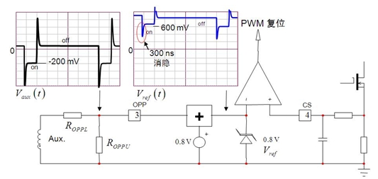 如圖 1 所示,電路中的光耦合器斷路或 TL431 分壓器網絡遭受嚴重漂移影響(或其某個電阻丟失或出現錯誤值)時,輸出電壓就可能超出規定的限制值,這就是過壓條件。大多數情況下,過壓條件可能對下行負載有害,適配器這時必須完全關斷。NCP1250/1 在 OPP 引腳上也集成了 3 V 參考比較器,這比較器可用于多種功能,如 OVP。如果這 OPP 引腳電壓連續四次超過 3 V,就使控制器 IC 閂鎖保護。