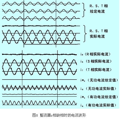 如果由于線路缺相,CT也檢測不到電流(例如r相電流ir=0),則由于平衡控制會使另外兩相電流的相位差變為180°,幅值相等(當然為補償“缺相”的那相電流,另兩相電流將增大),以滿足矢量和為零的控制要求,如圖8所示。此時,根據r、s、t相實際電流計算出的有功分量電流iq和無功分量電流id已經不是正常直流量,而是含有2倍頻(相電流頻率)成份的交流量,參見圖8,整流器無法正常工作。