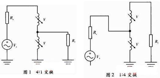 變壓器:主要實現低頻段,隨著工作頻段的升高,這類電路的應用越來越少。傳輸線變壓器可以實現寬帶阻抗變換,實現4:1和1:4工作模式如圖1和圖2所示。可以實現平衡和非平衡的變換,尤其在電視機外接天線到同軸線輸入端口的連接中得到應用。