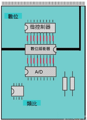 圖注: 使用高分辨率 SAR 模擬數字轉換器,轉換器電源與接地應連接至模擬面。模擬數字轉換器的數字輸出應有緩沖器,使用外部三態輸出緩沖器。這些緩沖器隔開模擬面與數字面,并提供高驅動能力。