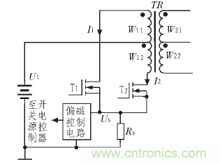 雙端型開關電源雙向驅動隔離變壓器,可以有效地提高隔離變壓器的使用效率,減小隔離變壓器的體積。為了防止隔離變壓器偏磁飽和,雙端型開關電源常常需要電流傳感器檢測輸入隔離變壓器的雙向脈沖電流,以進行電流的平衡控制和電路保護。圖2 為一個推挽式開關電源的防偏磁原理圖,電路以電阻RS作為電流傳感器,當功率開關T1、T2依次導通時,分別流過隔離變壓器原邊繞組W1和W2的電流I1和I2將被電阻RS以電壓US的形式向偏磁控制電路反饋。一旦兩路電流差值過大或某一路電流值過大,即說明隔離變壓器出現了偏磁飽和現象,由偏磁控制電路調節功率開關T1或T2的導通占空比,使隔離變壓器的雙向磁感應強度趨于平衡[2]。
