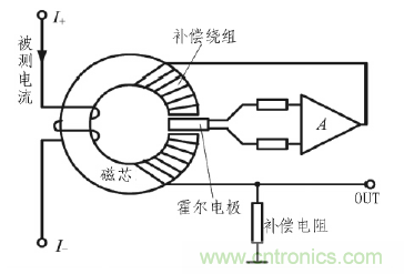 為了克服以電阻作為電流傳感器所產生的功耗,采用霍爾電流傳感器作為開關電源的電流傳感器。霍爾電流傳感器由磁芯、磁芯繞組、霍爾電極以及電壓放大器等組成,當被檢測電流流過磁芯繞組時,將在磁芯中產生磁場,磁場的磁感應強度將通過霍爾電極轉換為電壓,經過內部電壓放大器的放大和處理,以與被檢測電流成一定比例關系的電壓形式輸出。霍爾電流傳感器的構成有開環和閉環兩種形式,開環霍爾電流傳感器將霍爾電極的轉換電壓放大后的直接輸出,其電流容量大,但測量精度稍低[5];閉環霍爾電流傳感器采用磁平衡方式測量電流,測量精度高,線性度好,非常適合在開關電源中使用。閉環霍爾電流傳感器的結構如圖4 所示,被測電流通過繞組后在磁芯中產生磁場,磁場使霍爾電極上產生電壓,此電壓經放大器放大后輸出,同時經補償繞組使磁芯中磁場得到平衡補償,保證輸出電壓UOUT 與被測電流成嚴格的線性關系。