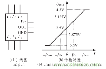 常用的TBC-DS 系列閉環霍爾電流傳感器的引線框圖和傳輸特性如圖5 所示[6]。圖5(a)所示的霍爾電流傳感器引線中,I+1~3和I-1~3是被測電流的串入繞組引腳, 其中,I+1和I-1是一個被測電流繞組的引腳,I+2和I-2、I+3和I-3也分別各是一個被測電流繞組的引腳。當3 個被測電流繞組并聯時,霍爾電流傳感器的額定測量電流為IPN1; 若將兩個繞組并聯再與一個繞組串聯時,霍爾電流傳感器的額定測量電流為IPN2;若將3 個繞組相互串聯時,霍爾電流傳感器的額定測量電流為IPN3。3 個額定測量電流間的關系為:IPN1=2 IPN2=3 IPN3。可見,通過3 組被測電流繞組的不同接法,可以改變霍爾電流傳感器的額定測量電流值,擴展測量區間。VCC為電源引腳,電源電壓通常為5 V;GND 是電源和傳感器輸出電壓的地;OUT 是傳感器電壓輸出引腳。由5(b)所示的霍爾電流傳感器傳輸特性可見,當被測電流為0 時,其輸出電壓UOUT =2.5 V;當被測電流不為0 且方向為從I+至I-時,輸出電壓UOUT>2.5 V,當被測電流不為0 且方向為從I-至I+時,輸出電壓UOUT<2.5 V。IPN和-IPN是霍爾傳感器的正負額定電流, 當被檢測電流達到額定電流時,根據電流方向的不同,輸出電壓UOUT 的值分別為3.125 V 或1.875 V, 即相對于2.5 V 的中心值有±0.625 V的偏移。當被檢測電流值絕對值大于IPN 時,霍爾傳感器仍可輸出與被檢測電流成線性關系的電壓值,直至被檢測電流達到霍爾傳感器的最大檢測電流IPmax。通常,IPmax>3 IPN。