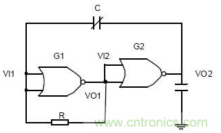 振蕩電路的作用是將電容的變化量轉(zhuǎn)化為頻率可變的方波。由圖3 可知,這是一個非對稱多諧振蕩器?;蚍情TG1 工作在電壓傳輸特性的轉(zhuǎn)折區(qū),把它的輸出電壓直接連接到或非門G2 的輸入端。G2即可得到一個介于高低電平之間的靜態(tài)偏置電壓,從而使G2 的靜態(tài)工作點也處于電壓傳輸特性轉(zhuǎn)折區(qū)上。反饋環(huán)路中電容使電路在兩個暫穩(wěn)態(tài)之間往復(fù)振蕩。