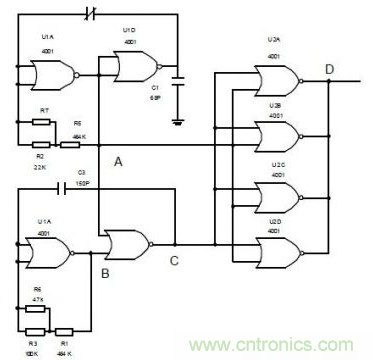 只要調(diào)整C 的脈沖寬度,就可以得到D 的脈沖寬度,從而可以消除零點電容,經(jīng)過調(diào)制的電容變化信號也就是濕度信號。將同一封裝內(nèi)的門電路U2A、U2B、U2C、U2D 并聯(lián)使用,可以擴大CMOS 門電路輸出低電平時吸收負載電流的能力。
