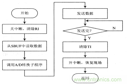 由于單片機(jī)多應(yīng)用于實(shí)時性較強(qiáng)的控制場合,為了盡量少占用CPU的時間,充分發(fā)揮CPU的功能。該系統(tǒng)在單片機(jī)程序設(shè)計中采用中斷方式與PC機(jī)進(jìn)行通信。主程序只進(jìn)行串行通信、數(shù)碼管實(shí)時顯示、模/數(shù)轉(zhuǎn)換結(jié)果的初始化和循環(huán)等待串行中斷工作,當(dāng)接收到PC機(jī)發(fā)來的信號時,就轉(zhuǎn)人中斷服務(wù)程序,進(jìn)行A/D轉(zhuǎn)換,并向Pc機(jī)發(fā)送數(shù)據(jù)。中斷服務(wù)子程序流程圖如圖6所示。