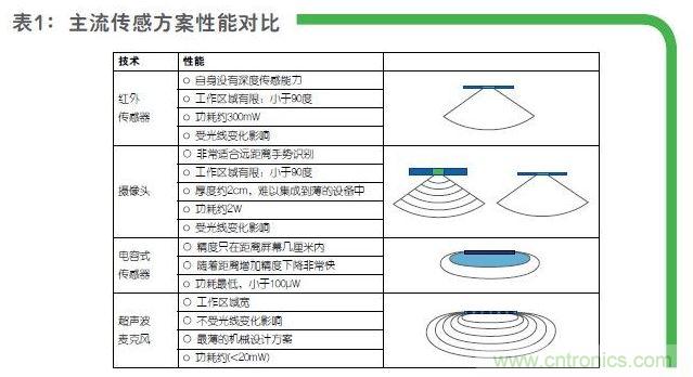 在數(shù)字超聲波麥克風(fēng)出現(xiàn)后,由于對環(huán)境光線沒要求(黑暗中也能精準(zhǔn)感測)、很容易測得距離/景深等特殊性能,有先見的系統(tǒng)公司紛紛采用該技術(shù)實(shí)現(xiàn)一些特有的手勢識別、距離感應(yīng)等應(yīng)用。Khamharn指出超聲波的方案性能相對更穩(wěn)定且成本更低,特地為大家對比了超聲波麥克風(fēng)和目前主流傳感器的性能對比,如表一所示。