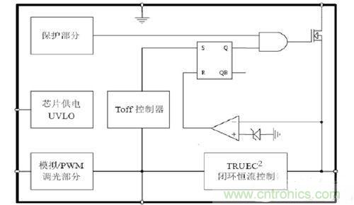 所謂開環(huán),不以檢測(cè)到的輸出電流值來(lái)做發(fā)出PWM信號(hào)的參考。所謂的閉環(huán),即真正檢測(cè)輸出電流值,以此為標(biāo)準(zhǔn)來(lái)發(fā)出PWM信號(hào)。從電路拓?fù)渖希邲]有區(qū)別。但是在芯片內(nèi)部對(duì)檢測(cè)到的如圖1 CS腳電感電流信號(hào),做專利技術(shù)處理,如圖2 TRUEC2部分。這樣,就檢測(cè)到了電感電流的平均值,也就是輸出電流的平均值。芯片針對(duì)檢測(cè)到的值,控制輸出占空比,實(shí)現(xiàn)了閉環(huán)控制。