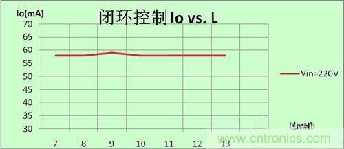 圖4可見,線性調(diào)整率為0,因?yàn)槿]環(huán)控制逐周期精確控制,輸入有任何變化,芯片會(huì)馬上檢測(cè)到并作相關(guān)的調(diào)整以便得到同樣的輸出;同理,如圖5及圖6,當(dāng)輸出電壓變化,電感量變化時(shí),芯片也會(huì)作相關(guān)的調(diào)整;正是因?yàn)槲覀兊娜]環(huán)高精度恒流控制方法,使電源做到了真正的恒流。這樣,量產(chǎn)的一致性可以控制到小于±1%.