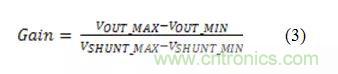 計算放大器的增益。運算放大器放大VSHUNT以產生VOUT_MIN到VOUT_MAX的輸出電壓擺幅,其中VOUT_MIN和VOUT_MAX分別是放大器的最小和最大輸出擺幅極限。公式3用于計算放大器產生所需的輸出擺幅的增益: