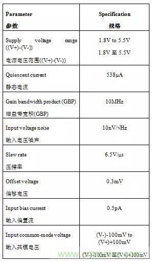 TLV906x系列高性能通用放大器可用于成本敏感型的低側電流感應系統,因為其增益帶寬(10MHz)、壓擺率(6.5V/µs)、偏移電壓(0.3mV)以及輸入共模電壓范圍為負電源電壓以下100mV。下表中列出了一些TLV906x系列的技術參數。