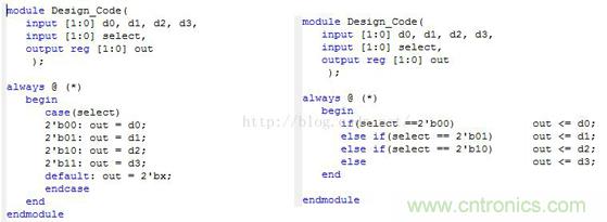 設(shè)計一個二位4路選擇器,由于選擇器使用條件觸發(fā)的方法對應(yīng)真值表進行匹配輸出與輸入,因此可以聯(lián)想到在C程序設(shè)計中的條件語句“If”和“Case”兩種,那么這兩種設(shè)計從硬件的角度出發(fā)有什么不同呢?