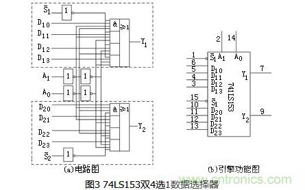 74LS153是一種集成的雙4選1數(shù)據(jù)選擇器邏輯器件。圖3所示為74LS153的邏輯電路圖和框圖。