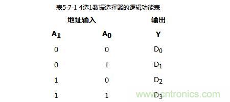 常用的多路選擇器有4選1、8選1、16選1等多種類型。下面以4選1數(shù)據(jù)選擇器為例介紹數(shù)據(jù)選擇器的工作原理。根據(jù)前面介紹的數(shù)據(jù)選擇器的功能,可以列出4選1數(shù)據(jù)選擇器的邏輯功能表,如表5-7-1所示。其中D0~D3為數(shù)據(jù)輸入端,A0、A1為數(shù)據(jù)選擇端。