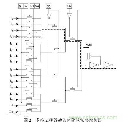 多路選擇器的左邊是 16 條輸入線,用于連接布線軌道或可編程邏輯塊等資源,S1~S6 代表 6 個可編程SRAM 單元,通過配置 SRAM 單元的內(nèi)容可以從 16條輸入線中選出 1 條作為有效輸入端,例如,當 S1~S6存儲單元的存儲值為“000100”時,輸入線 I3被選擇中,信號所經(jīng)過的有效路徑如圖 2 中虛線所示。多路選擇器的主體部分是傳輸晶體管,由于 NMOS 晶體管載流子的遷移效率高,電路速度快,因此,多路選擇器中的傳輸晶體管均采用 NMOS 晶體管實現(xiàn)。