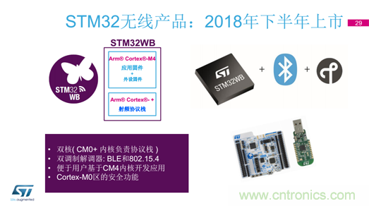 為應對日益復雜的物聯(lián)網(wǎng)協(xié)議及行業(yè)標準,STM32WB應運而生。作為STM32系列最重要的無線產(chǎn)品之一,STM32WB的“W”代表無線,“B”代表藍牙。它融合了STM32的生態(tài)系統(tǒng)和架構(gòu),以及開放射頻,擁有2個CPU、2個調(diào)制解調(diào)器和射頻收發(fā)器,能夠覆蓋更多的應用領(lǐng)域,特別是無線應用。STM32WB的雙核(CM0+ 內(nèi)核負責協(xié)議棧)保留了Arm® Cortex®-M4部分,其復制了L4系列的架構(gòu),這意味著用過L4產(chǎn)品的開發(fā)商可以輕松使用STM32WB產(chǎn)品。而且STM32WB的部分產(chǎn)品樣片已經(jīng)在今年2月份面世,預計到年底就能實現(xiàn)大規(guī)模上市。