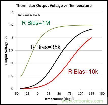 熱敏電阻的缺點是,只有在很窄的溫度范圍內(nèi),它的輸出才是線性和準(zhǔn)確的,而在這個范圍之外會變得非線性。圖2繪制了三條熱敏電阻的輸出曲線,偏置電阻分別為1MΩ、35kΩ和10kΩ。在窄溫度范圍內(nèi),每條曲線都是線性的,不過在偏置電阻分別為1MΩ、35kΩ和10kΩ,而溫度分別為10ºC、75ºC和50ºC以下時,這三條曲線為非線性。雖然針對特定溫度,可以使用專門校準(zhǔn)的熱敏電阻來實現(xiàn)目標(biāo)精度,但是這種熱敏電阻成本較高,并且這三款不同的器件也使得庫存管理變得過于復(fù)雜。其它缺點還包括無法預(yù)計的故障、抗擾度低和功耗較高。