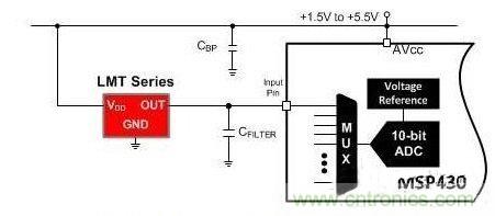 模擬溫度傳感器是一個有源半導(dǎo)體器件,它的輸出是與溫度成比例的電壓值或電流值。作為一個集成電路 (IC),模擬溫度傳感器具有熱敏電阻所不具備的內(nèi)置智能性,從而使與模擬溫度傳感器有關(guān)的設(shè)計工作變得簡單。圖3顯示了其中一款TI LMT系列模擬溫度傳感器的典型應(yīng)用,在這個應(yīng)用中,只有IC,而未使用外部組件。