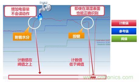 由于潮濕的表面,會(huì)增加電容量。即使在潮濕的表面,也能正確識別按鍵,從而避免了電容自感方式下的觸摸誤動(dòng)作。