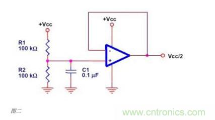 單電源工作的運放需要外部提供一個虛地,通常情況下,這個電壓是VCC/2,圖二的電路可以用來產生VCC/2的電壓,但是他會降低系統的低頻特性。