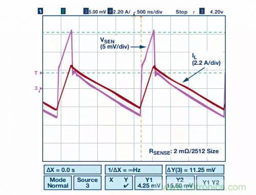 圖5中,電流檢測電阻RSENSE與電感串聯,因此可以檢測連續電感電流,此電流可用于監測平均電流以及峰值或谷值電流。所以,此配置支持峰值、谷值或平均電流模式控制。