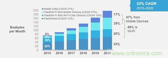 移動網絡和Wi-Fi流量占有率比較。固定式/Wi-Fi流量自2018年起超越固定式/有線(wired)網絡流量(來源:Cisco)