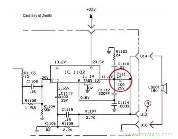 下圖是音響輸出電路中所使用的直流隔直電容的情況(圖中紅圈是電容)。
