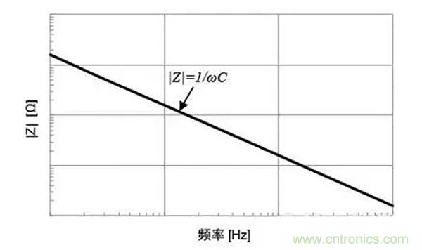 由公式(1)可看出,阻抗大小|Z|如下圖所示,與頻率呈反比趨勢p少。由于理想電容器中無損耗,故等價串聯電阻(ESR)為零。