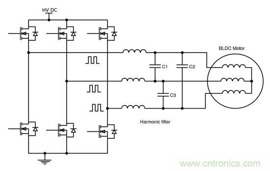 圖4:電機驅(qū)動EMC濾波中的薄膜電容器。