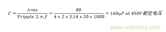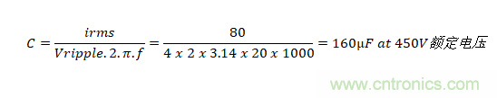 如果僅需要電容器來控制電動汽車動力系統(tǒng)等直流線路上的紋波電壓,則在選擇電容器時將會呈現(xiàn)顯著不同。 總線電壓可能與以前一樣為400V,但由采用電池供電,因此不存在穿越需求。在下游轉(zhuǎn)換器以20kHz的開關(guān)頻率提取80Arms脈沖電流時,將紋波限制在4Vrms以內(nèi)是非常現(xiàn)實的, 所需的電容是: